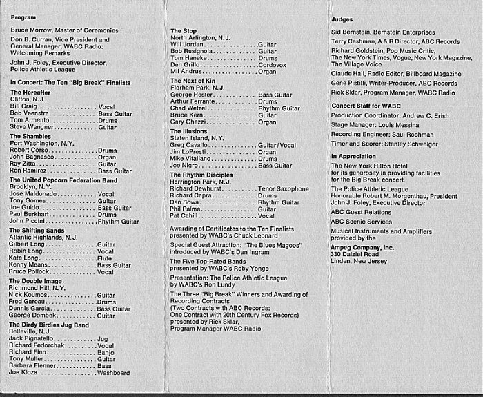 In the Fall of 1967 WABC launched a new feature known as "The Big Break." The idea was to give local rock bands a chance to win recognition and a recording contract. Each night, Cousin Bruce Morrow played a special recording from a local group. The artists introduced themselves and their original songs. Of course, only the best recordings made it to Bruce's show. After twelve weeks, the finalists were brought to a playoff concert in the grand ballroom of the New York Hilton. A recording contract was awarded to the best group. As part of that first concert, WABC invited "The Blues Magoos" to be the featured performers.